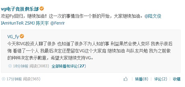 Fy宣布离队的消息,VG俱乐部就此事发表了官方公告。公告中指出Fy单方面离队违反协议,短期内将无法加入其它俱乐部,同时警告前管理不要有危险动作,否则将追究其责任。。