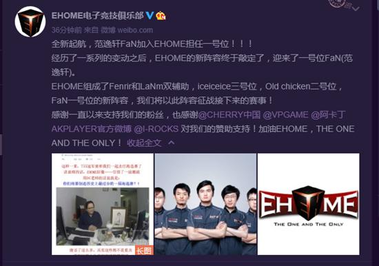 EHOME组成了Fenrir和LaNm双辅助,iceiceice三号位,Old chicken二号位,FaN一号位的新阵容,我们将以此阵容征战接下来的赛事!
