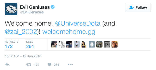 EG战队推特宣布宇宙哥universe和完成学业的Zai一同归来,将一起从TI6海选开始征战。
