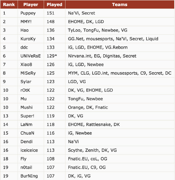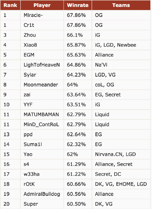 Reddit上一个帖子:迄今所有V社赛事(5届TI+3届特锦赛)中出战过至少两届的选手胜率排行和出战总场数排行见图.