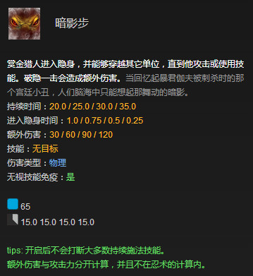 而相比于赏金猎人,SA的技能更适合打Gank输出,但不适合打发育Carry位,隐身系英雄的通病就是身板脆,稍微被针对就会很难受。(在这里不得不提一下小骷髅,因为大招吃怪的存在,在前期他还是蛮肉的,但是吃不到怪的小骷髅依然是一张纸,一戳就破。)