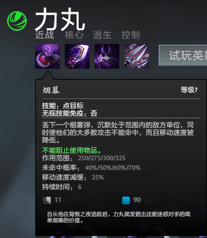 烟幕——一个技能同时提供减速、致盲、沉默,像这样恶心的技能全Dota里也没有几个,由于是范围性持续的沉默效果,SA对战某些英雄时会有奇效,例如潮汐猎人,幻影长矛手,灰烬之灵等。