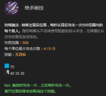 小技巧:由于这个技能在施放时就会攻击第一次,所以B到敌人身后,砍出一刀被刺,再迅速开大,即能瞬间砍出两刀附带被刺的伤害。(SA这个英雄攻击前摇很短,但是没有装备辅助时攻击间隔较长。)