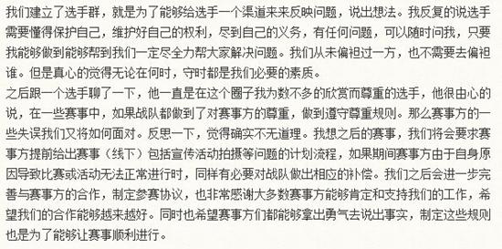 6月15日,由于VG战队成员不满ACE的处罚决定,引起了圈内选手们对于ACE联盟的一顿讨伐,事件一度弄得沸沸扬扬。而ACE联盟的廉洁则一直作为发言人的形象在和外界交流,由于ACE在圈内的名声实在太差,廉洁也自然成了众矢之的,引来网友一片谩骂。16日下午,廉洁再度发表长文,态度诚恳的解释了一些联盟的工作内容等,但对玩家玩家关心的制度发布和奖金发放问题并没有提及。