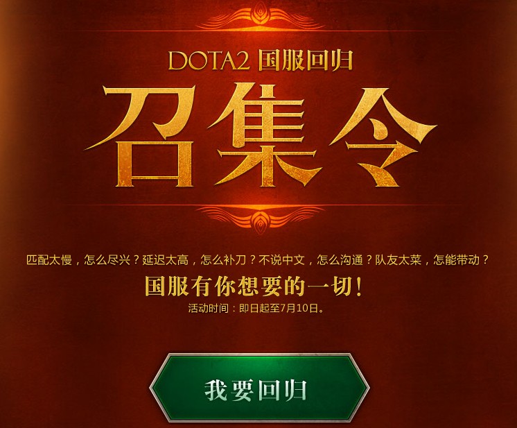 DOTA2国服回归召集令是外服老玩家回归国服的有效途径,玩家只要拥有DOTA2外服全球体验资格,同时游戏账号的游戏时间满足当前阶段的回归条件,那么该玩家即可在回归页面填写申请资料后百分之百的获得DOTA2国服VIP测试员资格。值得注意的是,目前只有拥有DOTA2全球体验资格的外服玩家才能顺利回归哦!
