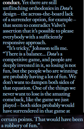 他谈到:“DOTA2作为一款竞技游戏,快乐来自于赢得比赛,而在这种快乐里,通过不懈努力最终翻盘的胜利最值得回忆。以我个人举例,那些输掉的比赛不会在记忆中停留很久,但一场大翻盘可以被我津津乐道很长一段时间。所以我们觉得应该鼓励这种不放弃的精神。在游戏里添加投降系统是一种强盗行为,它剥夺了玩家最大的快乐来源。”