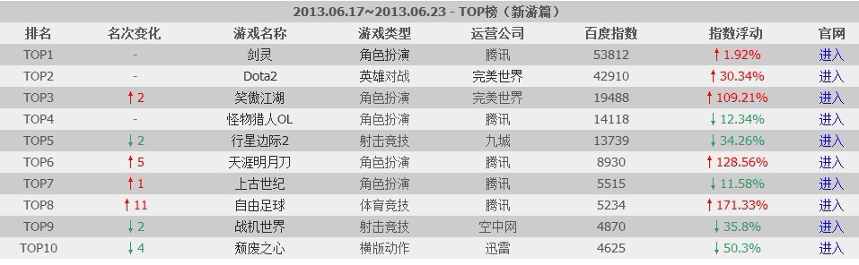 完美最近做了一件大好事,《DOTA2》将于7月全球同步上市,意思就是说我们之后想玩这游戏不用激活码了。其实这种竞技游戏每次热度增长都是一些事件型的消息影响会比较大,这次也算是大消息了。上周《DOTA2》百度指数42910,增长30.34%,位列TOP榜第二。