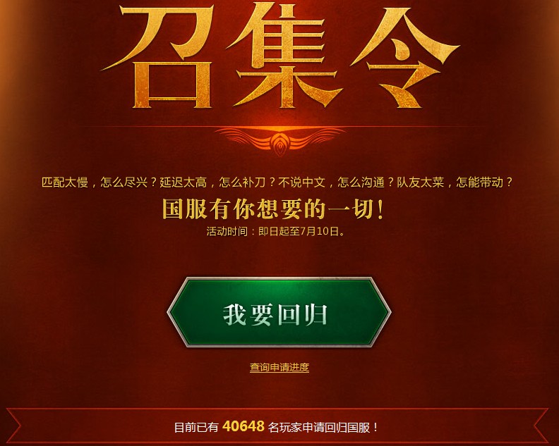 匹配太慢,怎么尽兴?延迟太高,怎么补刀?不说中文,怎么沟通?队友太菜,怎能带动?今天中午12点,DOTA2国服回归召集令将跳过300小时阶段,直接开放200小时回归阶段,满足广大玩家的回归热情!而截至目前,申请回归国服的玩家总数已经超过40000人,你回归了吗?