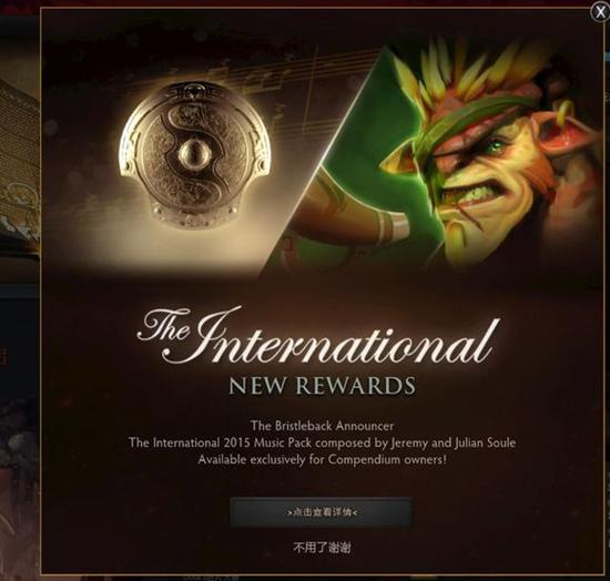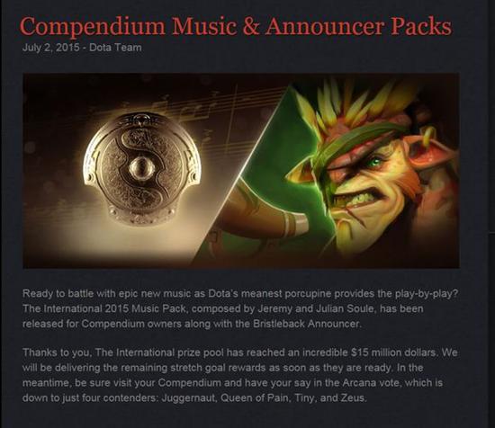 首先看看官博:TI5总奖金正式突破1500万美金大关,TI5音乐包和钢背兽广播员包已经开始发放给拥有小金本的玩家,其他目标奖励还在制作中,这意味着不朽3还在制作中。