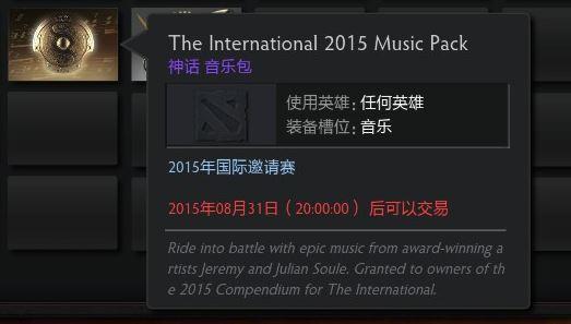 TI5音乐包和刚背兽广播员,都为2015年8月31日(北京时间9月1日)以后可以交易。TI5音乐包很不错,大家可以装备听看看,还没收到的也不要急,这个是逐波发放的。
