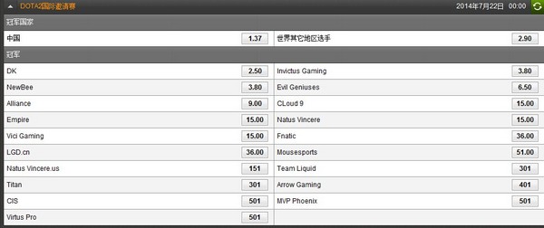 TI4开赛在即,而近期国外公司也开了TI4的相关盘口,在冠军盘口一栏中国队夺冠赔率仅有1:1.37,可见中国队夺冠大热。