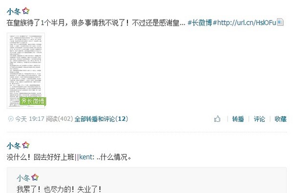 “在皇族待了1个半月,很多事情我不说了!不过还是感谢皇族能够给新人机会,也感谢皇族给我们稳定的训练环境!不过,2个月的工作我已经尽力了!由于工资问题,我们错过了几个一线队员。在此我要声明下,不是我小冬能力不行,是俱乐部工资问题,我能联系的队员我已经联系了,我尽力了。而且那有一线的队员来的时候只要求了4000RMB的工资。