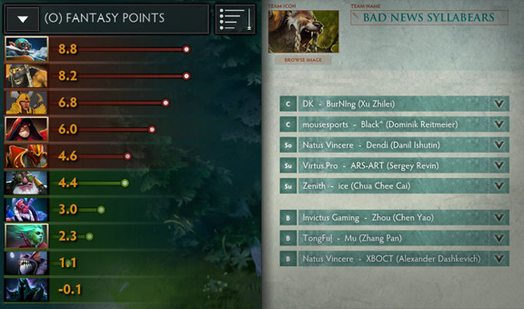 组建一支由参加国际邀请赛的队员组成的梦之队。随着他们比赛场次的增加,您的梦之队也会获得积分。在邀请赛结束的时候,您的每一支梦之队都会为您赢得一件物品,该物品取决于您的队伍在比赛中的表现。游戏内的用户界面系统会记录您的梦之队队员获得的积分,如此您可以很方便的和您的朋友进行比较和比试。梦之队的队长面板和战斗聚焦都会在国际邀请赛的网页上以及比赛中显示。