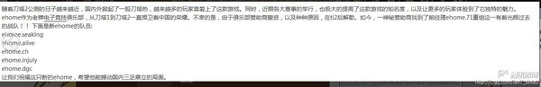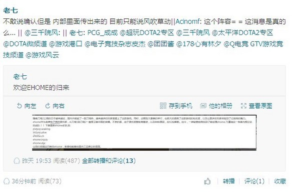 在第二届DOTA2国际邀请赛过后,曾经的王者之师EHOME宣布解散,前EHOME经理71也曾说EHOME无重建希望并自己已退出电竞圈。在今天,小编在微博上发现了关于EHOME重组的消息,DOTA2民间解说老七称内部消息说一神秘赞助商找到前EHOME经理71,要他重组这一有着光辉过去的战队