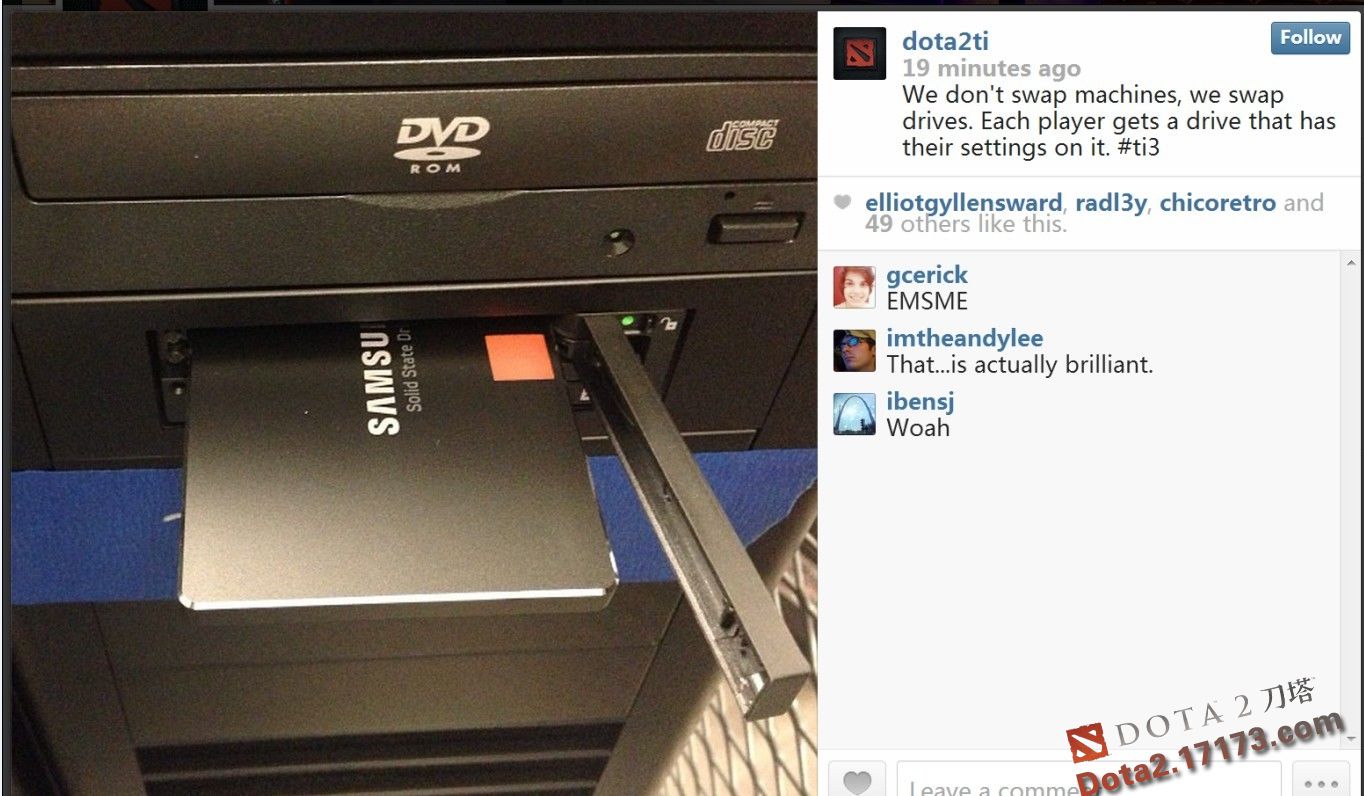 逆天的地方来了!每个选手比赛的时候,不是换主机,而是换硬盘!每个选手都有自己独立的选手硬盘,硬盘里面有他们的相关DOTA2设置。 HOHO