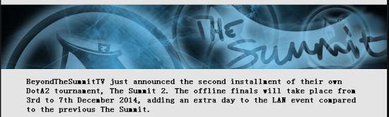 不久前,TS举办方BeyondTheSummit宣布将会举办第二届The Summit联赛,这次The Summit 2线下决赛将于2014年12月3日-12月7日在洛杉矶举行,借鉴于上一届,第二届线下决赛将会比以前增加多一天。