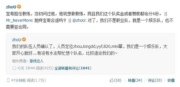 8月5日夜间,CIS战队官方微博和zhou神高调公布了他们一直计划组建的新战队(相关新闻),除了早早确定下来的三位成员:zhou、longdd、YYF,老将820再次出马,近期刚刚成为国服天梯第一人的CIS小将june“mini幂"成为了最后一名队员。而zhou宝龙的另一位成员:宝哥zippo将成为这支新战队的教练。zhou神这次组队并不是为了打出成绩,并没有计划回归职业DOTA。
