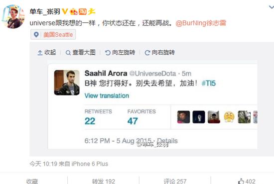 IG负于秘密惨遭淘汰后,EG战队Universe发推特安慰B神,随后,著名解说单车微博截图转载了该条推特,并且怒喷CHUAN神。