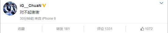 同时,CHUAN神也发表了微博,对不起谢谢。