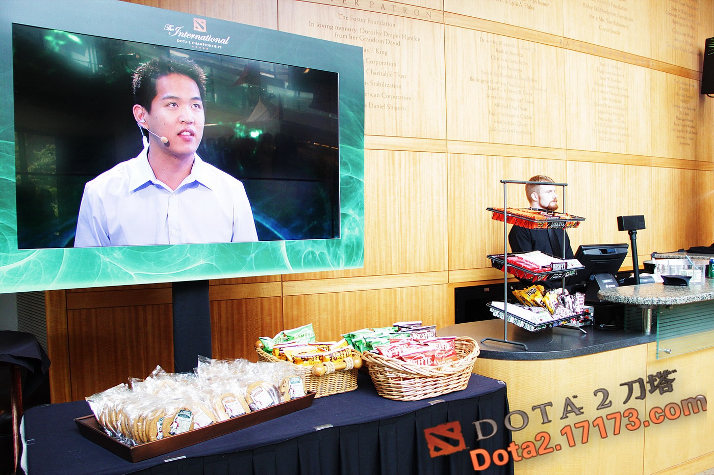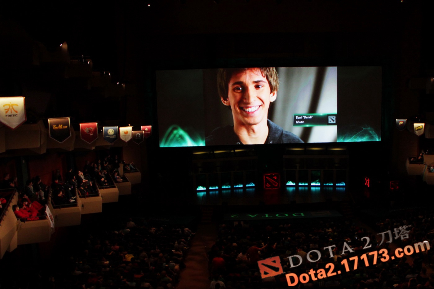 Navi对Orange赛前播放战队采访专辑,画面上的是Navi.Dendi,他参加了三届的TI比赛