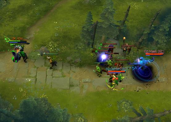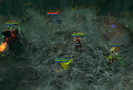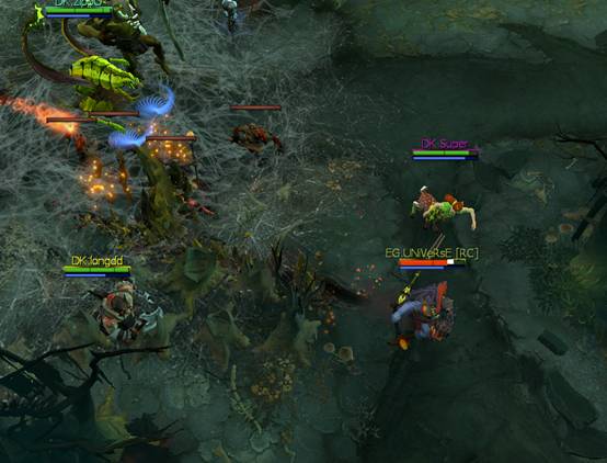DK四人直冲1塔塔后,断兵速度清兵,己方兵线压至EG塔下,四人插下真眼企图强杀蜘蛛失败,后又想杀lion,结果剧毒被先手插起,无法对lion造成减速效果,追不上,DK四人作罢,开始对线。