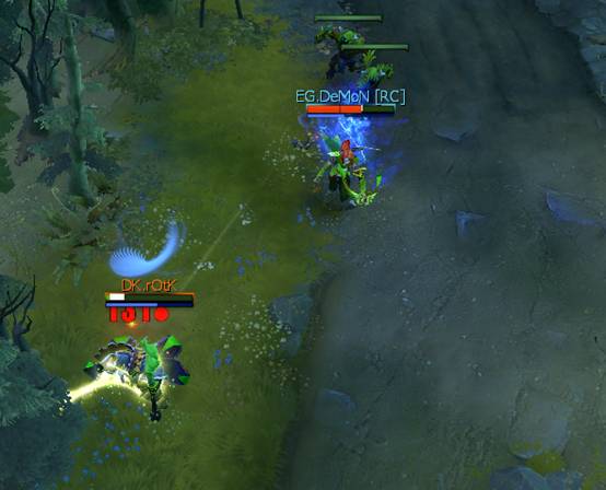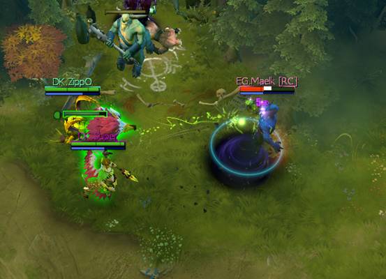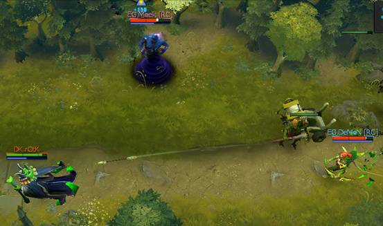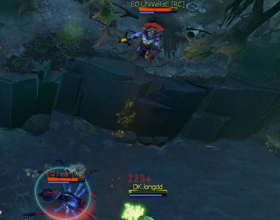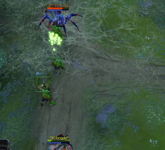 DK四人直冲1塔塔后,断兵速度清兵,己方兵线压至EG塔下,四人插下真眼企图强杀蜘蛛失败,后又想杀lion,结果剧毒被先手插起,无法对lion造成减速效果,追不上,DK四人作罢,开始对线。