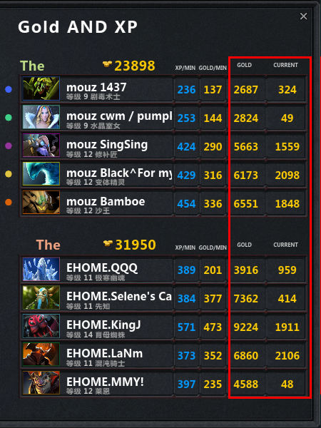 这个时候我们来总体的观察一下双方金钱,等级,装备的情况。