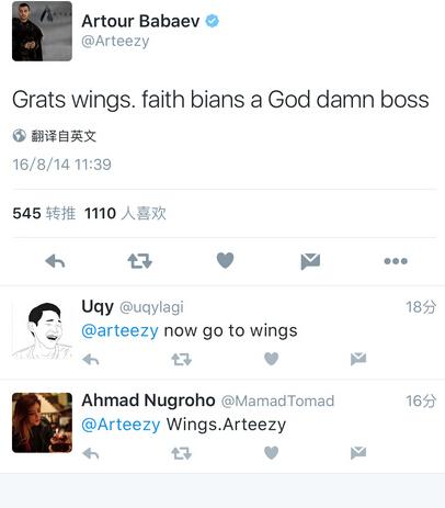 就在TI6国际邀请赛后,对于Wings夺冠的消息,国外的一些知名选手纷纷在推特发表了自己的看法,rtz表示faith bians很强,无敌的大boss。