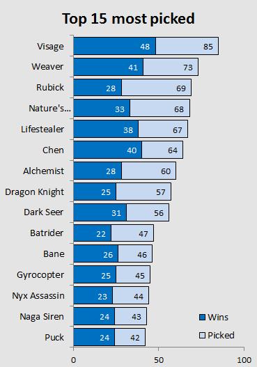维萨吉:作为TI3最热门的辅助英雄,灵魂超度的高伤害和短CD让维萨吉刚三能力非常强。守墓人斗篷为他提供了生存能力,佣兽即可开视野,输出也不弱。作为出场次数最多的英雄,他的胜率也能达到56%。