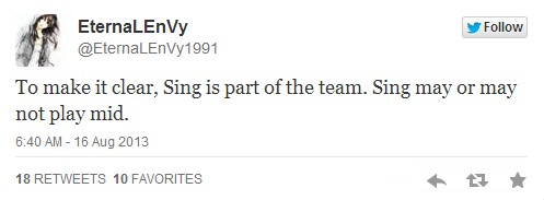 但就在8月16日清晨,EnternalEnvy官方发布消息称:SingSing已加入我队,位置还未确定。相信Kaipi选择SingSing的理由有很多,一是为了迎接本周末的EiZO杯;二是继COMEWITHME走后,SingSing已作为Kaipi的替补队员两周之久,他已然成为K的一份子。此外,他们一起获得了BigPointBattle的冠军,以及TheDefense4的亚军。据EnternalEnvy透露:SingSing将和COMEWITHME分得价值7,000美元的奖金。