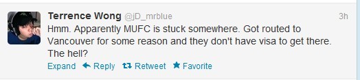 他说MUFC现在转机到了加拿大的温哥华,而他们没有去加拿大的护照。