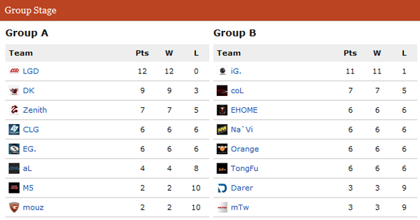 到目前为止本次杯赛表现最抢眼的莫过于LGD战队,他们斩获了无可争议的疯狂12连胜,未尝一败,紧随其后的是11胜一负的iG战队。两只中国战队已经锁定了各自小组的小组第一。与之形成鲜明对比的是来自东欧和西欧的队伍在本次比赛是如此的不给力,mouz M5 Darer与mTw把持着小组垫底的位置。