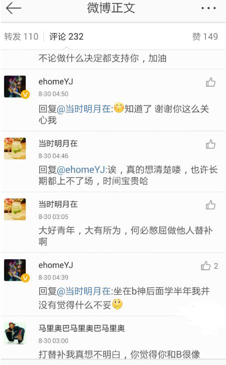 8月30日凌晨,妖精在微博中回复确认了这一事:坐在B神后面半年并没有觉得有什么不妥。