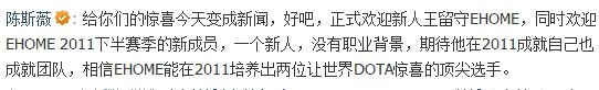 纠缠数日的 国士无双离开 EHOME转会 iG.Y事件大幕落下,晚间EHOME俱乐部产品经理 陈斯婷在微博上正式公布了国士无双正式留队的消息。