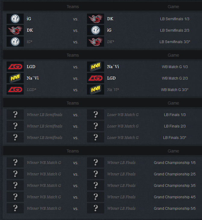 四强大战之后,将由LGD和Na'Vi比赛的败者,对阵DK和iG的胜者,最后是五局三胜制的总总总决赛!四强中除了Na'Vi之外全部是中国队,这次其实已经圆满了,希望DK、iG和LGD都能全力以赴,为大家献上精彩的比赛!