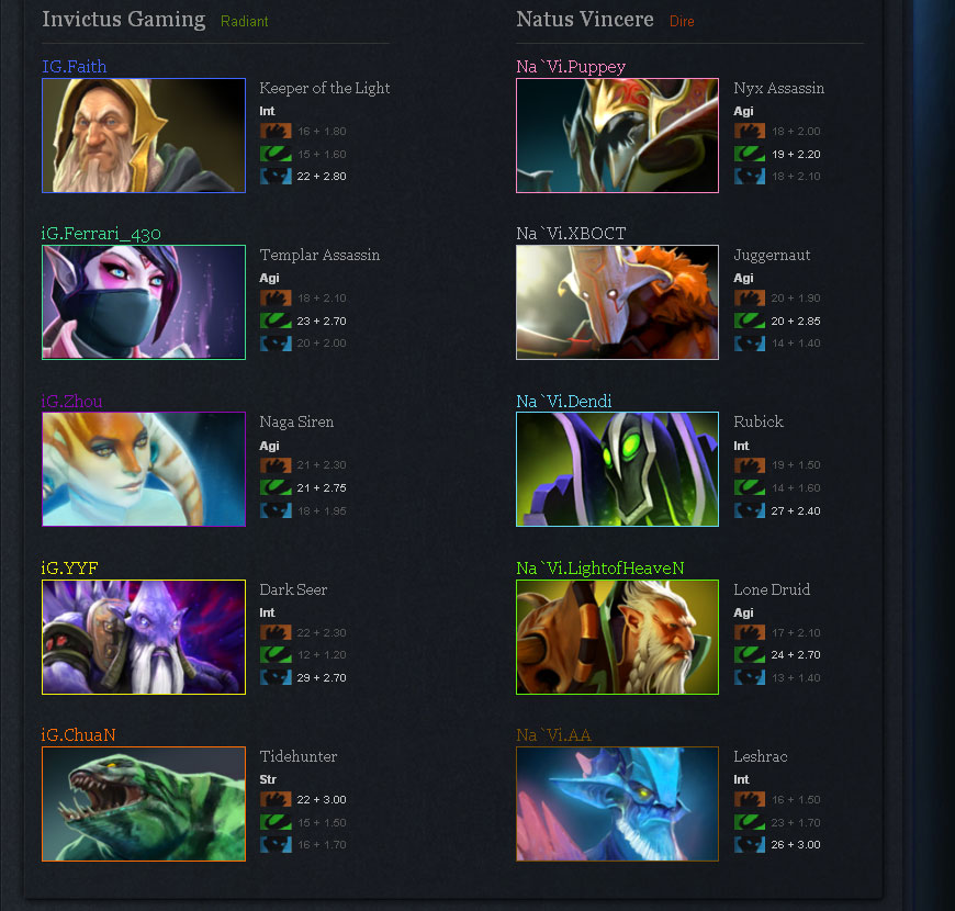 还好iG及时调整,稳定了下来,双方进入farm期,iG通过光法和黑暗贤者守塔,不与Na'Vi正面冲突,此时Na'Vi外塔全破,iG还有5个外塔,这样选择是非常正确的,局势慢慢再次倾向iG,节奏出来了!在之后的稳扎稳打中,iG保持了优势,顺利的推倒Na'Vi,打出了GG!!!iG获得了总冠军!扬我中华Dota魂!壮哉我大IG!