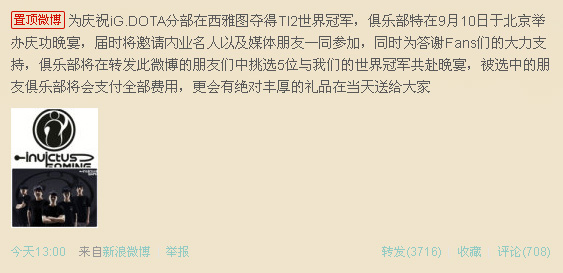 今天iG电子竞技俱乐部在新浪微博上发布了一条新消息:为庆祝iG.DOTA分部在西雅图夺得TI2世界冠军,俱乐部特在9月10日于北京举办庆功晚宴,届时将邀请内业名人以及媒体朋友一同参加,同时为答谢Fans们的大力支持,俱乐部将在转发此微博的朋友们中挑选5位与我们的世界冠军共赴晚宴,被选中的朋友俱乐部将会支付全部费用,更会有绝对丰厚的礼品在当天送给大家。