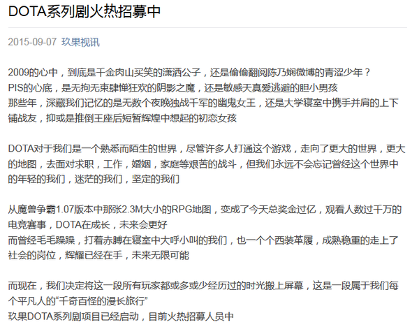 FTD选拔刚刚结束,酒神就迫不及待的开始了下一步的动作。昨日,酒神的玖果网络科技公司发布了自己招聘演员,准备进行一部DOTA网络剧的拍摄。早在之前的大型情感节目酒神有约已经深受广大水友的喜爱,而酒神筹备的DOTA网络剧也是水友希望看到的。