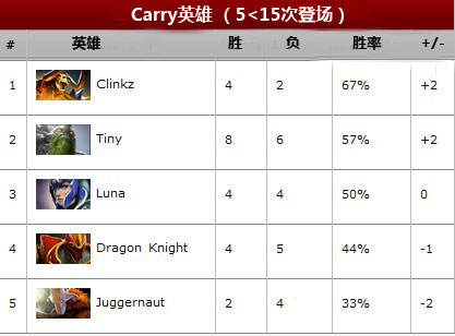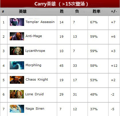 本届比赛中异军突起的carry英雄当属圣堂刺客。圣堂是所有carry英雄里胜率最高的。值得一提的是在使用圣堂获胜的比赛中,圣堂的场均击杀死亡比达到了5:1。另外一个英雄是变体精灵,也是几乎常常碰到,尽管在比赛的最后一天它的胜率被各种拉低。另外的两大carry英雄,敌法、熊德则在决赛日表现大亮,变体精灵的锋芒完全被他们掩盖了。娜迦海妖的整体表现其实一点也不好,不过这也是由于很多队伍对她的估计过高以及使用不当导致的。即便是强如LGD、iG和Na'vi这样的队伍使用小娜迦也没少输。