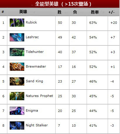 全能型英雄是个有趣的分类,我们把拥有多种分路方式并且可以选择通用型出装路线(比如梅肯、推推、长笛、战鼓之类)的英雄归为此类。当然,这个分类规则未必有多正确,还有像一些gank或者副Carry类的英雄比如夜魔和酒仙也是可以归为此类的。另外被划进这一类英雄在分路方面比较多变,比如灵魂鹿、潮汐和拉比克。拉比克的数据足以说明为什么很多人都说他强的过头。他既有爆发,又能打辅助,中solo也很强,而这这个英雄最强的地方就是只要你拿了拉比克,你就可以放给对手一些技能比较强的英雄。你只需要把它们手里的强力技能偷过来就可以。