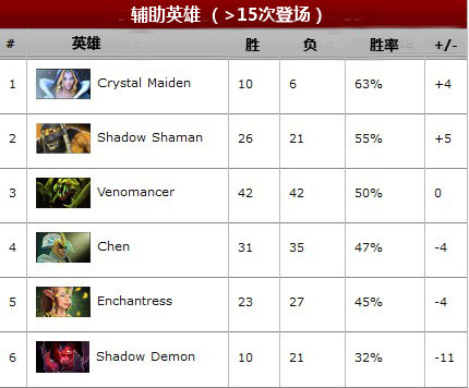 辅助中的辅助:水晶室女是最成功的,尽管她的登场次数不及暗影萨满和剧毒术士。萨满这个英雄完全是在这次比赛中被抬到了这么高的位置,这下我们会在之后的主流阵容中频频看到他的身影了。基本上本次比赛中发挥比较不错的辅助英雄,都是偏向于推进型的。队伍也很倾向于选择全能型英雄来打辅助,比如拉比克和老鹿潮汐以及巫妖和复仇之魂等等。本届比赛中的悲剧之王则要当属暗影恶魔,他以前就很厉害么?需要注意到的是中国队伍几乎没有选择过这个英雄。尽管他能对敌法师起到部分克制作用,不过出场几率越来越低了。