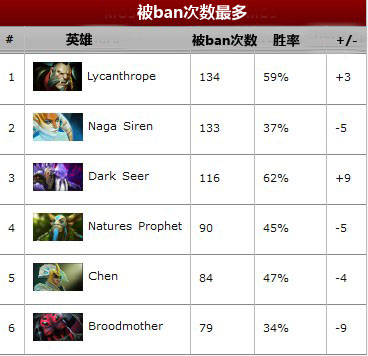 受折磨的灵魂已经流行了一段时间了,他的推进能力、防守和输出能力功不可没。而且他的分路也很灵活,定位主要还是来打辅助。剧毒术士的登场频率也是很高,另外祈求者同样很热门,他的路线很多变,而且能适应大多数阵容的需要。拉比克只有20多场比赛没有出现在前6ban中,之后63%的胜率对于这个高ban率的英雄来说并不高。娜迦海妖的数据有点令人失望,这个英雄被所有的战队忌惮,以至于被ban掉了133次,这个ban率仅次于狼人。但是娜迦海妖在比赛中的实战效果可没有这么理想,这可能说明多数dota2队伍还是缺乏创新精神,他们愿意ban掉目前的主流IMBA英雄而不是好好去思考到底怎么对付他们。先知与蜘蛛与娜迦海妖的情况也很相似。
