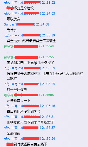 来自中南大学的Hx参加了数个高校联赛,他谈到某个高校比赛从选拔赛就开始缩减成本,比赛在好久没见过的破网吧开打,打到一半还停电,好不容易取得成绩还被拖欠奖金,参加创联赛获得的奖金不到半月就发了,所有比赛开销全部报销。