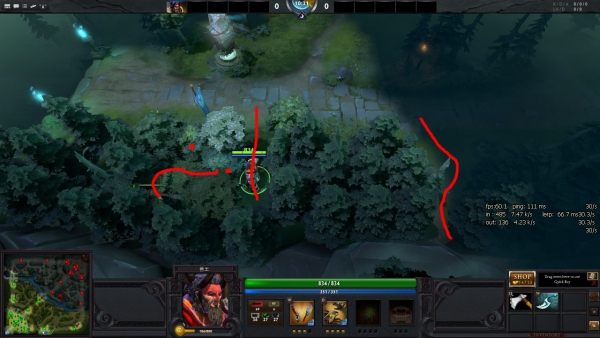 2. 天辉上一塔,天辉劣势路的这边树林是非常洗漱的,随便就能进去。最上面还有一排塔前单行道,图不够大,所以彪偏了点。