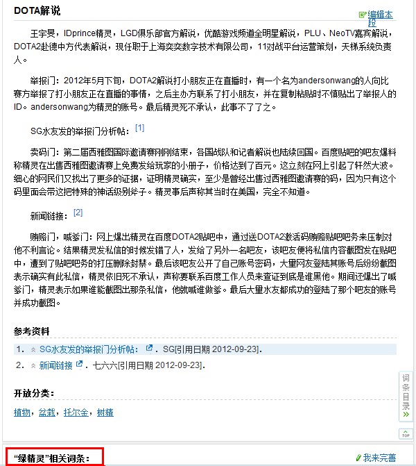 今日此事再次曝出新情况。某网友在论坛发帖爆料说自己已经将精灵出售DOTA2相关游戏产品的消息提交了百度百科,并且已经得到百度审核通过。