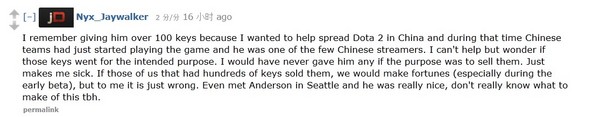 今天早上JoinDota站点的编辑就精灵卖激活码的事件,在国外最火爆的DOTA2社区之一Reddit中作出回应:”我记得当初我给了他超过100个的激活码,因为我想帮助DOTA2在中国更好的普及,而在那时,中国战队才刚刚开始接触DOTA2,他也是当初为数不多的直播解说之一。我如果知道他拿激活码去干这些事(指拿去卖),我就肯定不会给他了。如果我们把这几百个码拿去卖,我们可以一夜暴富,尤其在测试早期,但我认为这绝对是错误的。之前我在西雅图见过安德森(精灵的英文名),他是很好的人。