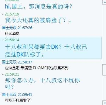 本站为大家报道了 EHOME的两位成员 357和 Dai已经加盟 DK的消息,有玩家在得到消息后第一时间联系了 国士无双,国士无双表示他也无法联系到俱乐部,之后他透露了自己可能会退役: