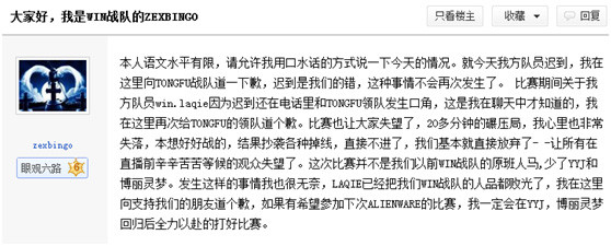 WIN战队的ZEXBINGO也在百度贴吧向致TongFu.DotA歉。