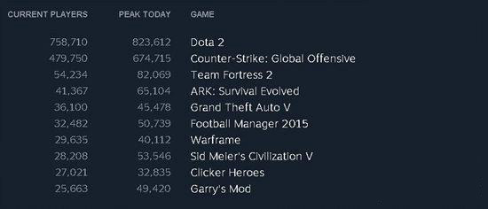 目前Steam用户数量已经超过1250万人,游戏数量也超过6000款,根据页面信息得知,目前Steam平台最受欢迎的游戏仍是《DOTA2》,排名前五名的游戏是:《DOTA2》、《反恐精英:全球攻势》、《军团要塞2》、《方舟:生存进化》、《侠盗猎车5》,除此之外《足球经理2015》、《文明5》、《星际战甲》、《点击英雄》和《半条命2:物理沙盘》等游戏也是玩家目前比较喜爱的。