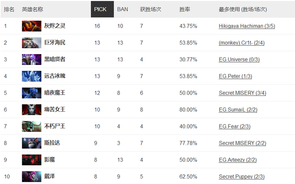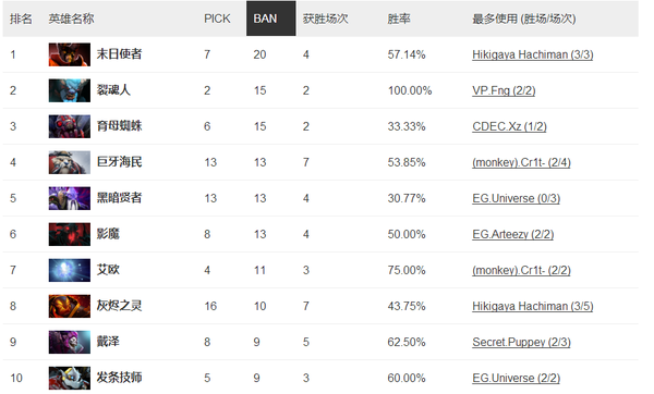 值得一提的是“铁男”发条同样被DOTA2所重视,60%的不错胜率看来在DOTA2里也不能随便放“铁男”。其他的BAN人都是比较常规大热中单辅助,如日中天的火猫一步一步的重回最热中单的地位,经过ESL ONE、MLG两个世界级的比赛已经证明的火猫必定会在秋季赛上有这惊人的表现。